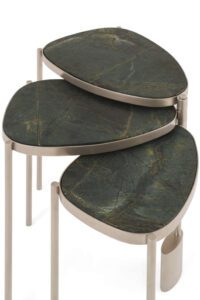 Alguns dos destaques em mobiliário são o sofá Eos, as poltronas Nyx e Pollux, a cadeira Daphne (que pode ser plissada ou lisa), as mesas laterais Calliope, Euterpe e Thalia (que remixam rochas naturais com acabamento high gloss) e a mesa de jantar Minos, além de outros móveis emblemáticos como a mesa de centro Midas (construída a partir de pedras naturais e com tampo elaborado em chapa de couro fino) e a ultra-versátil mesa lateral Fylla, composta por três peças sobrepostas em alturas e formatos diferentes. “São peças que tem uma missão para além da ergonomia: quero estimular o diálogo e o convívio entre as pessoas – fundamentos que são a base da civilização grega”.
