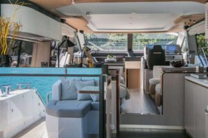 O flybridge é mais um ambiente que se destaca, pensado em acomodar três áreas distintas: estar e relaxamento, refeições e navegação com segundo posto de comando, tudo equipado com móveis exclusivos e revestimentos de alto padrão italiano, próprios para ambientes externos, sem falar na tecnologia de navegação com modernos painéis touch screen. Mais um diferencial é que a Azimut Yachts trouxe ao Brasil o requinte e a versatilidade do “lounge” de proa, com uma operação simples proporciona ainda mais o aproveitamento do espaço, que pode ter tanto um layout de sofás frente a frente com uma mesa de centro, quanto a configuração tradicional com sofá e mais o solário.
