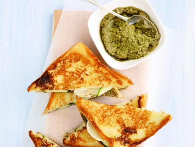 Ingredientes:8 fatias de pão de forma4 colheres (sopa) de molho pesto½ queijo de cabra¼ abobrinha100…