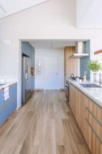 A marcenaria elegante e a península central chamam atenção com o azul que se sobressai em meio à paleta predominantemente off-white. A escolha se alinhou com o conceito de um design leve e contemporâneo, que celebra a proximidade com a natureza. “A ideia era criar um ambiente que realmente transmitisse a tranquilidade do litoral, aproveitando ao máximo a vista e a proximidade com o mar,” explica o profissional.