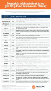 Um minucioso levantamento feito pela nutricionista clínica, esportiva e ortomolecular, mestre e doutora em nutrição Dra. Milena Cornacini, mostra os benefícios e indicações médicas e cada substância presente no ovo. A tabela completa deste estudo, com a composição média nutricional do ovo, pode ser acessada abaixo.